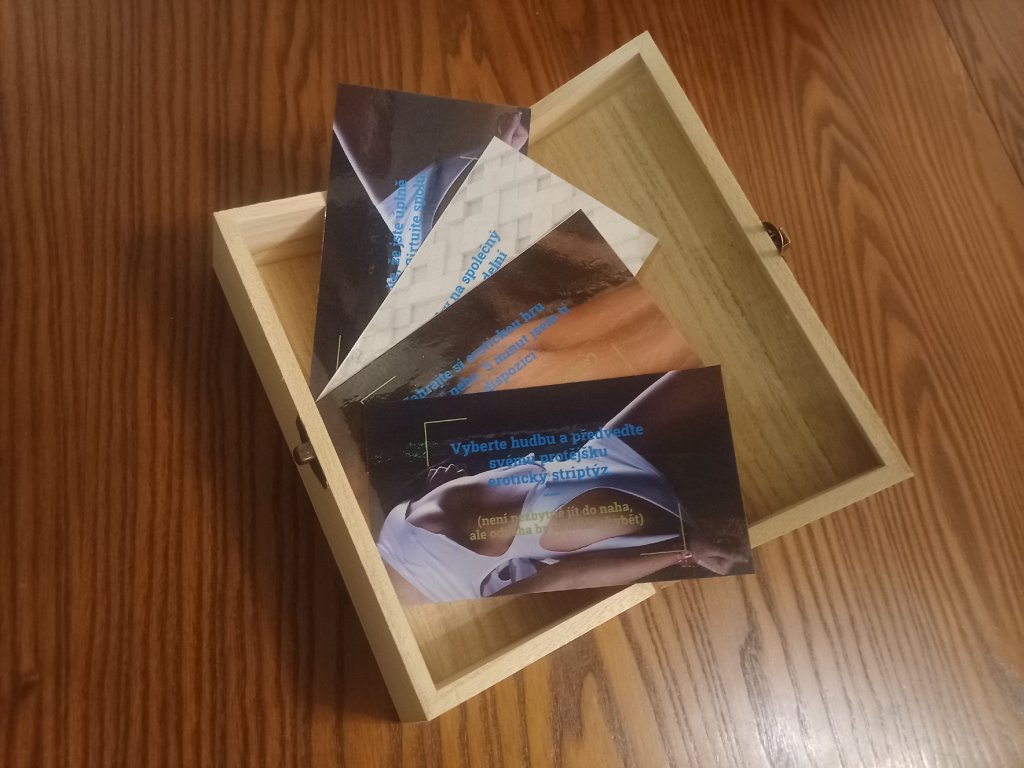 Obsahuje 30 + 1 bonusovou kartičku s úkoly v dřevěné krabičce.